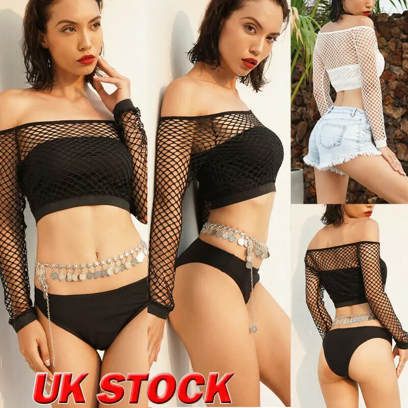 » Price Sexy Women's Casual Hollow Off Shoulder Long Sleeve Crop Tops Vest Mesh Fishnet Perspective See Thr